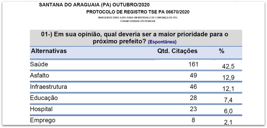 Segundo a pesquisa, para 42,5% da população local, a saúde do município deixa a desejar e deve ser a principal prioridade do próximo prefeito, para outros 12,9% da população santanense a falta de asfalto é o maior problema da cidade, outros 12,1% entendem que a falta de infraestrutura deve ser o foco.